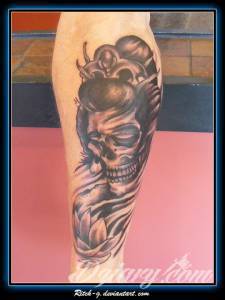 Witam. Posiadam tatuaz na przedramieniu, jest to starzec, któremu widac część szczęki, a na dole znajduje sie zegar. Szukam pomyslu na projekt, ktory moglby wykończyć moje przedramie w całości. Chciałbym by tatuaz skomponował sie z poprzednim. Planuje miec rękaw w niedalekiej przyszłości, lecz budżet pozwala mi tylko na.dokończenie dolnej części reki. Interesuje mnie tematyka jaka znajduje sie na obecnym tatuazu, czyli przemijanie czasu, zegary, ale także ukryte zamiłowanie do Japonii. Nie wiem czy daloby sie jakos skomponować to. Myslalem cos o gejszy, ktora ma wachlarz, ktory dziala jak rentgen, ale to bardziej na.gore reki. Prosze o rady :-) zdjecie tatuazu dodaje poniżej