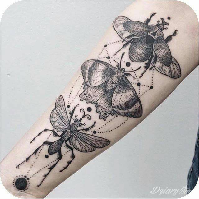 Tatuaże geometryczne niepokojąco kuszące wzrok. Łączą prostą formę opartą na kilku kształtach jak i duże formaty o spójnej kompozycji graficznej stworzonej z niewielkich symboli.