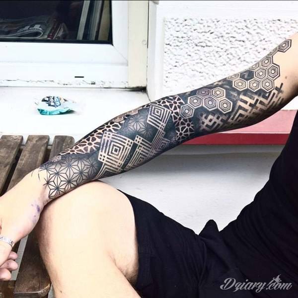 Tatuaże geometryczne niepokojąco kuszące wzrok. Łączą prostą formę opartą na kilku kształtach jak i duże formaty o spójnej kompozycji graficznej stworzonej z niewielkich symboli.