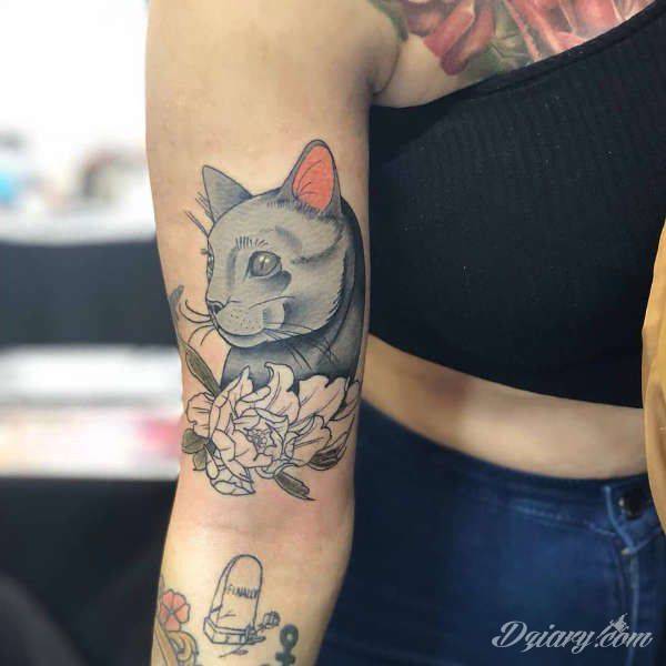 Kocie tatuaże to nie tylko duże projekty sympatycznych milusińskich. Tatuaże z kotami to również małe projekty, które dyskretnie ozdabiają miejsca częściowo zakryte - fragmenty uszy czy obręcz barkową.