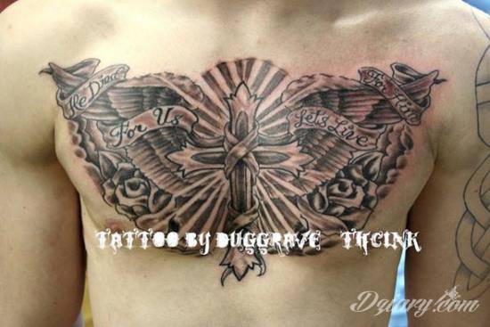 Tatuaże podkreślające nie tylko przywiązanie do religii. Krzyże o różnej formie - od cienkich po potężne; stylizowane na drewno jak i krzyże o metalicznej postaci czasami podkreślone dodatkowym łańcuchem.