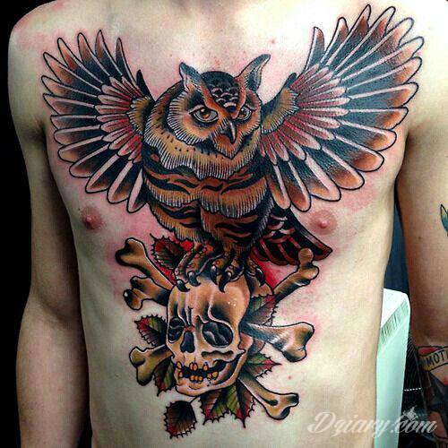 Tatuaże z sową symbolizują cierpliwość, wiedzę i inteligencję. Nie są, jakby mogło się wydawać, statyczne i wyłącznie melancholijne. Sowa szczególnie ciekawie wygląda na ramionach. Odpowiednio zarysowana, podkreśla charakterystyczną budowę szczególnie męskiego ciała.
