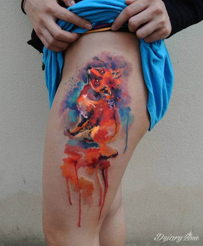Akwarelowe tatuaże watercolor stanowią intrygujące połączenie unikatowych wzorów i rozbudowanej kolorystyki. Kreska jest w nich rozmyta; tworzą intrygujący efekt graficzny farby swobodnie przelewanej na skórze.